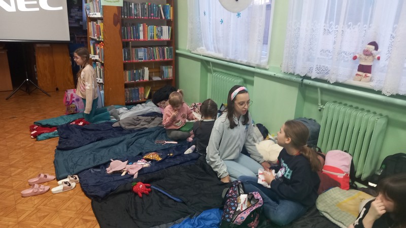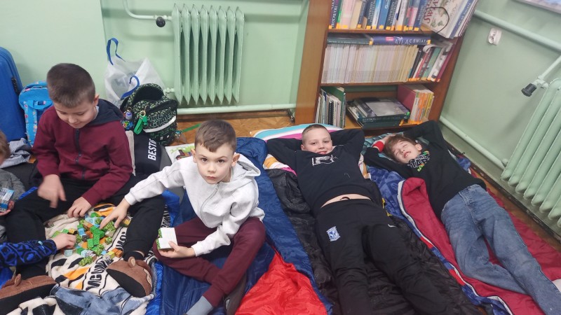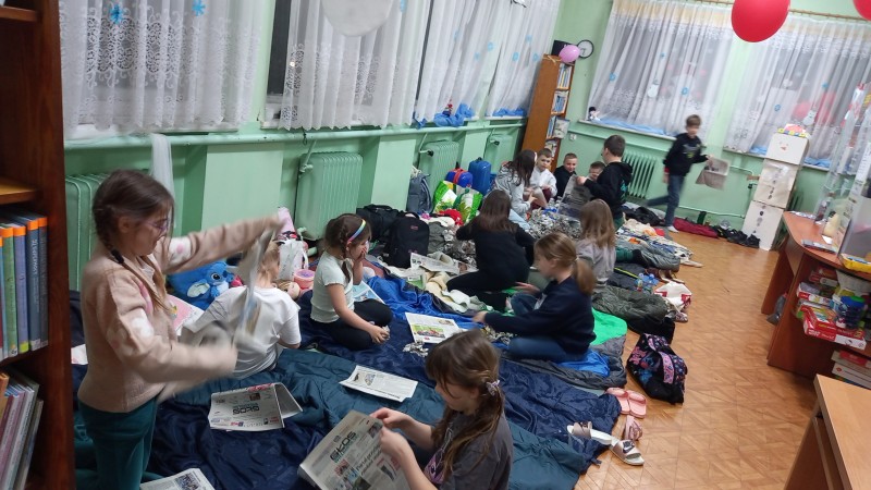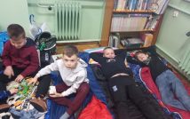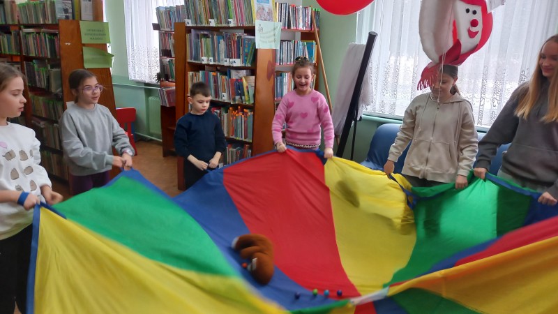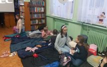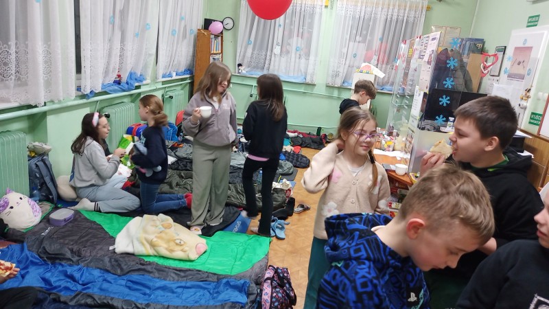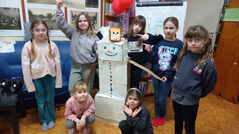 Podczas wieczornych zmagań dzieci zostały podzielone na grupy, a każda z nich musiała wykonać różnorodne zadania. Na początek uczestnicy wymyślali zimowe nazwy dla swoich drużyn, wykazując się kreatywnością i poczuciem humoru. Następnie przyszedł czas na budowanie bałwana z kartonów – powstały prawdziwe, imponujące konstrukcje. Nie zabrakło również emocjonującej „wojny” na gazetowe śnieżki, zimowych kalamburów oraz innych integracyjnych zabaw. Jednym z najbardziej wyczekiwanych punktów programu było wspólne pieczenie pizzy. Przygotowane własnoręcznie przysmaki wszyscy ze smakiem zjedli na kolację. Wieczór umiliło także czytanie opowieści o bałwanku Olafie z książki Kraina lodu, co wprowadziło uczestników w jeszcze bardziej zimowy nastrój. Po kolacji przyszedł czas na taniec z balonami i taneczne wygibasy, które dostarczyły mnóstwo śmiechu i radości. Zmęczeni, ale szczęśliwi uczestnicy po wieczornej toalecie szybko zasnęli, by nabrać sił na poranne podsumowanie. Rankiem dzieci zakończyły grupowe zmagania, podzieliły się swoimi wrażeniami i otrzymały pamiątkowe dyplomy uczestników „Bałwankowej Nocy” oraz małe upominki. Zadowoleni, pełni pozytywnych emocji i gotowi na kolejną biblioteczną przygodę, wrócili do swoich domów.