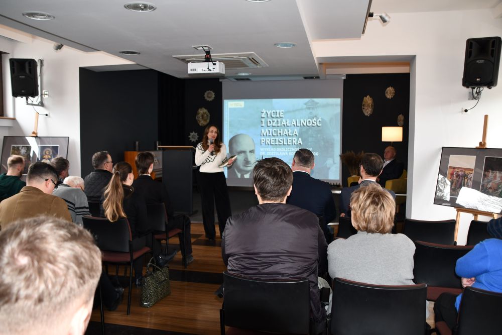 Dalsza część uroczystości odbyła się w naszej bibliotece, gdzie dr Zdzisław Kościański, inicjator wydarzenia, wygłosił wykład pt. „Życie i działalność Michała Preislera”. Prelekcja przybliżyła uczestnikom sylwetkę bohatera wydarzenia, jego dokonania oraz realia epoki, w której przyszło mu żyć i działać.