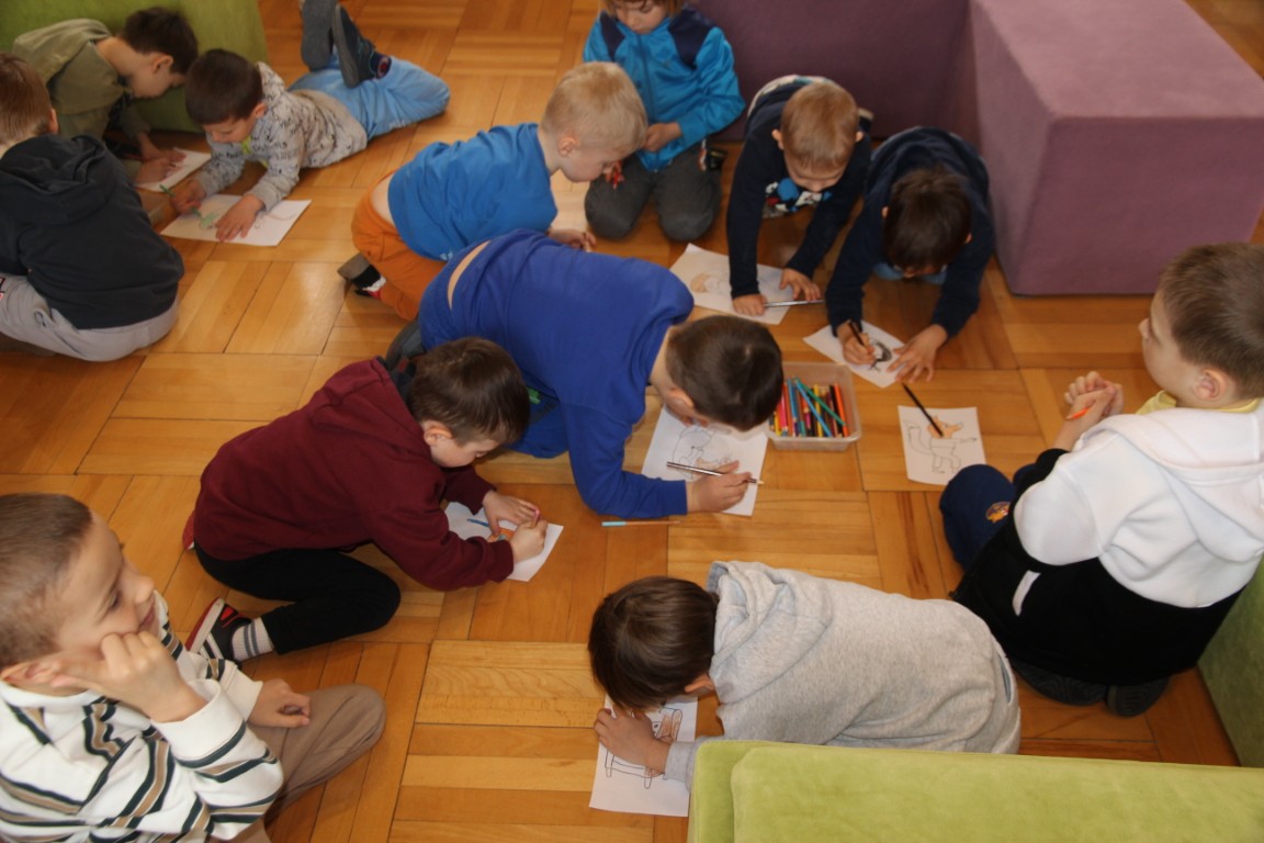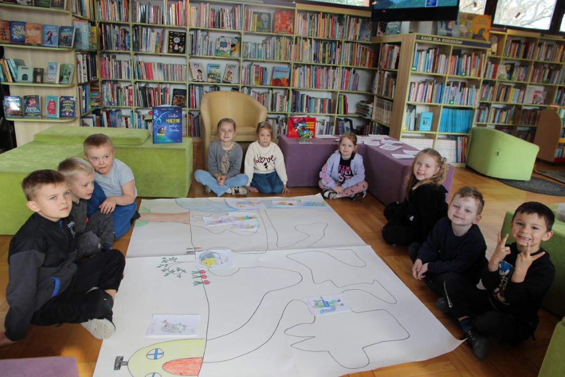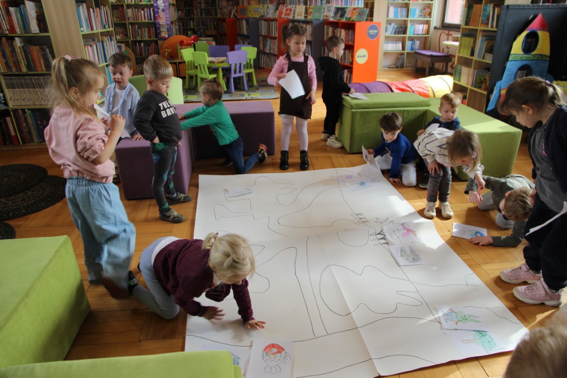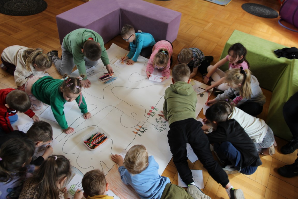 Na zakończenie spotkania dzieci wspólnie pokolorowały dużą planszę z bohaterami poznanej historii, co było miłym i twórczym zwieńczeniem zajęć.