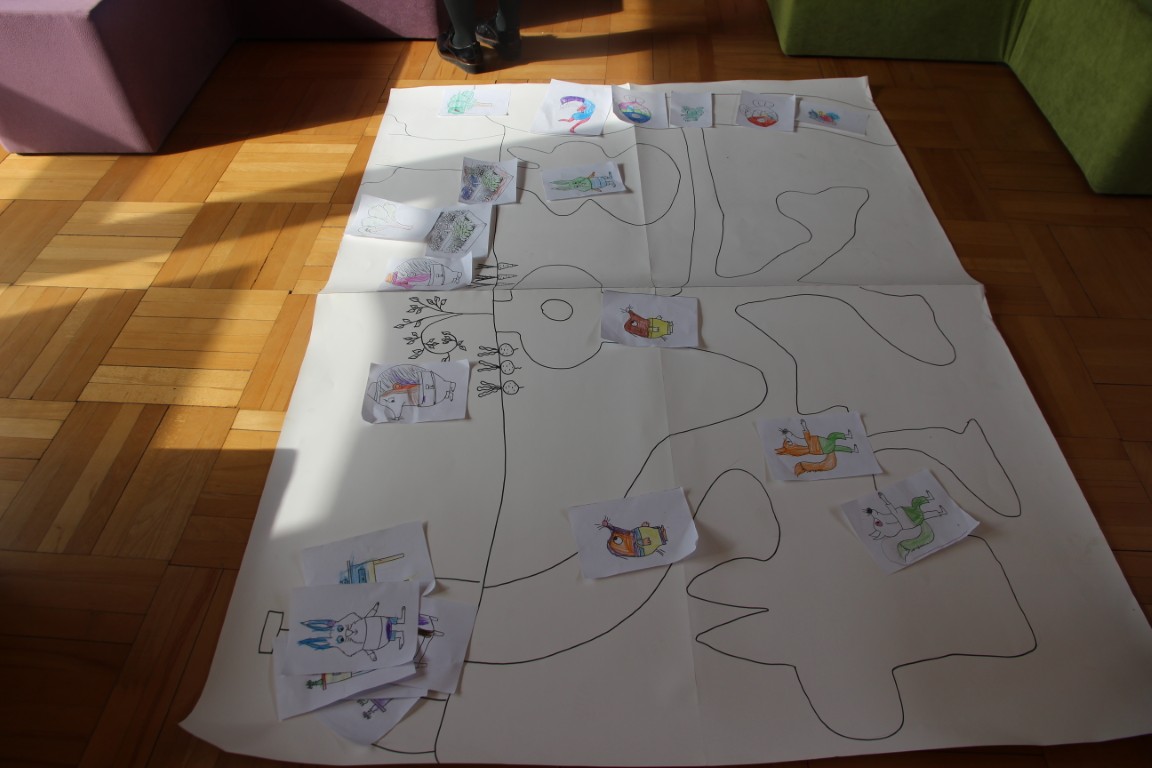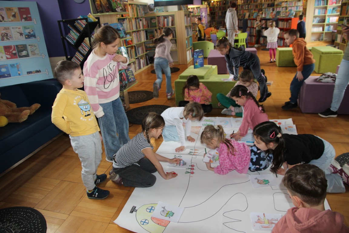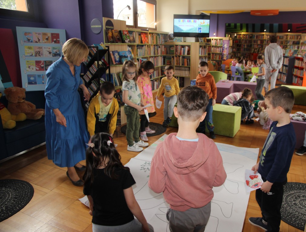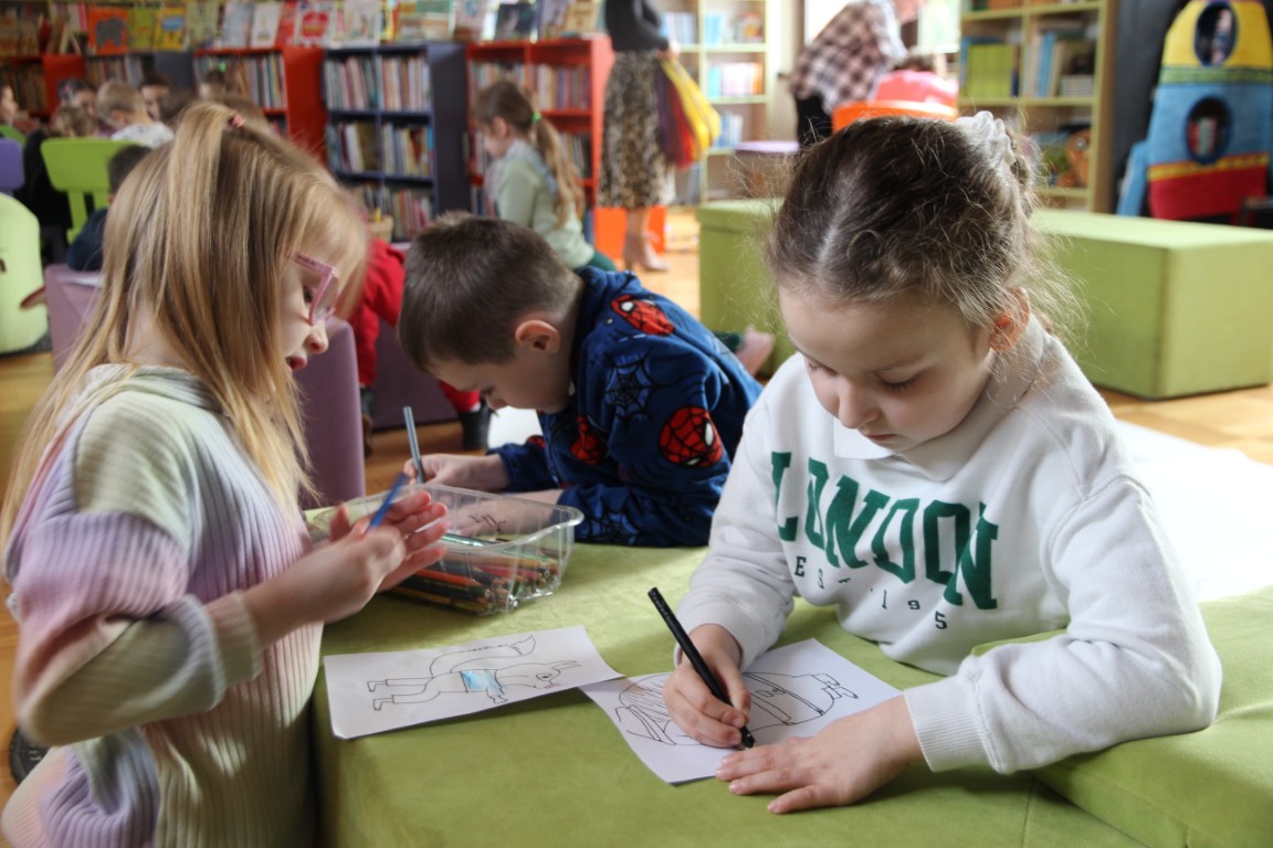 Na zakończenie spotkania dzieci wspólnie pokolorowały dużą planszę z bohaterami poznanej historii, co było miłym i twórczym zwieńczeniem zajęć.