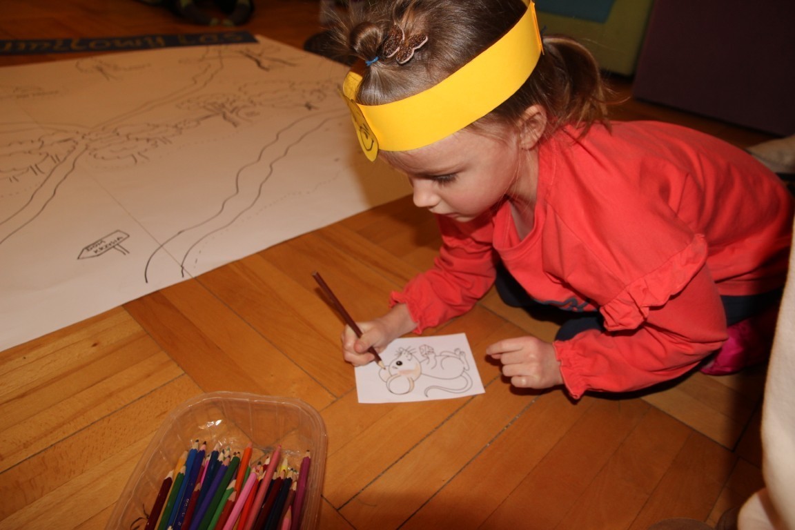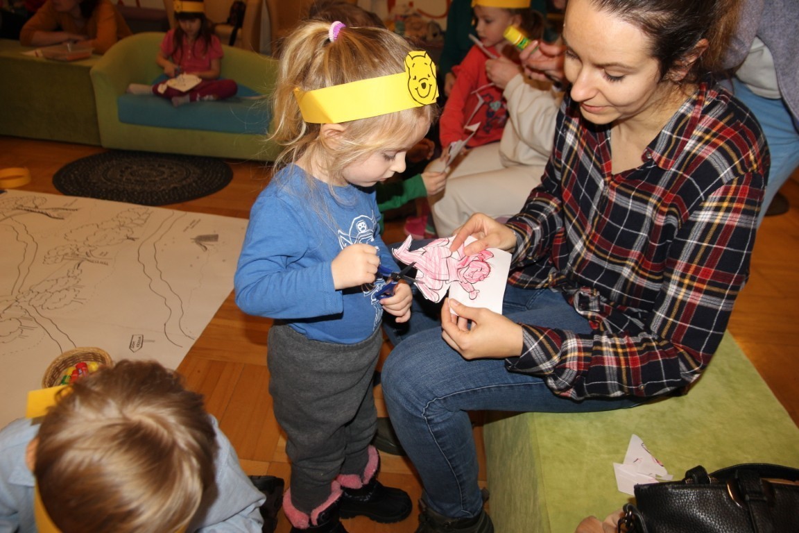 Na początku uczestnicy wykonali kubusiowe opaski na głowę, a następnie wyruszyli symbolicznym pociągiem do Stumilowego Lasu. Podczas tej niezwykłej podróży dzieci szukały numerków prowadzących do zagadek o mieszkańcach bajkowej krainy. Z dużym zainteresowaniem wysłuchały również opowieści pt. „Kubuś Puchatek u króla”.