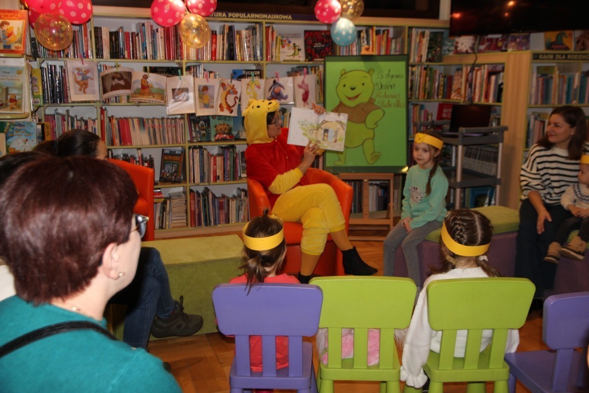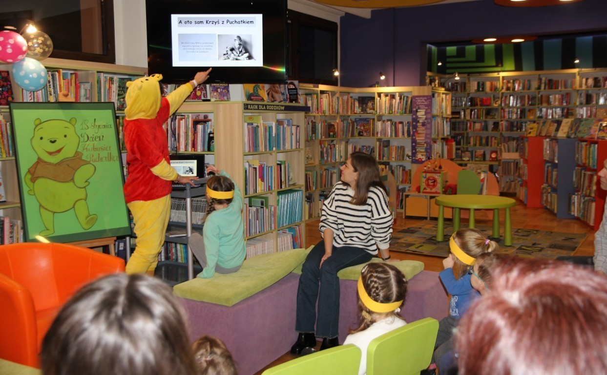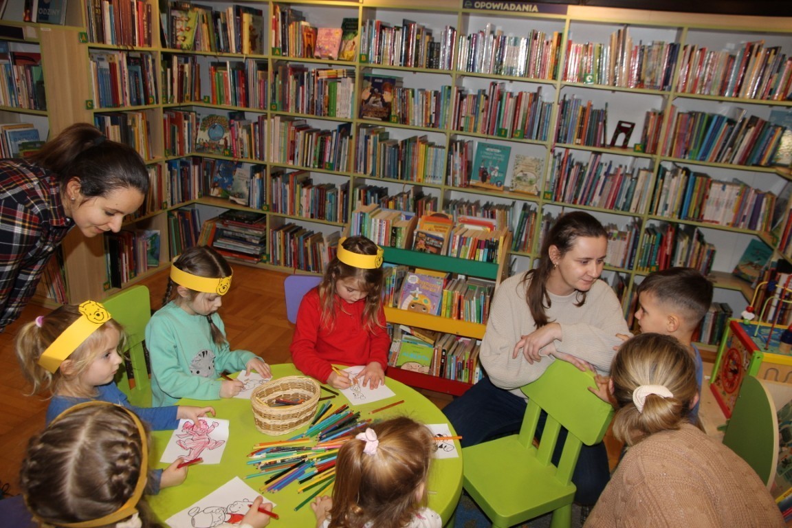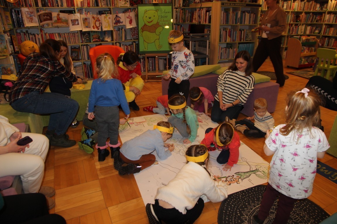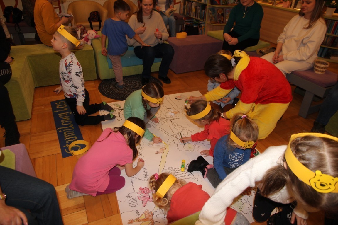 W czwartkowe popołudnie, 15 stycznia 2026 roku, w bibliotecznej Strefie Koloru odbyło się radosne spotkanie z okazji Dnia Kubusia Puchatka. W wydarzeniu wzięły udział dzieci wraz z opiekunami, którzy z ogromnym entuzjazmem przenieśli się do świata Stumilowego Lasu.