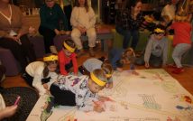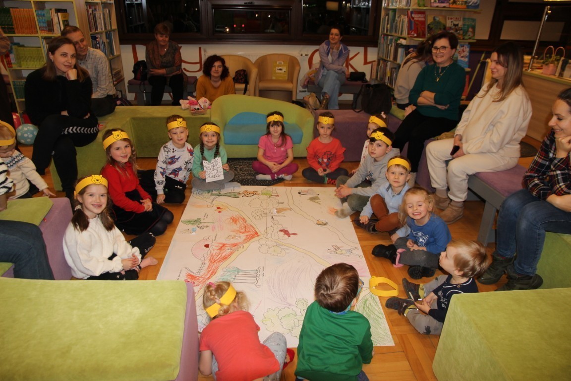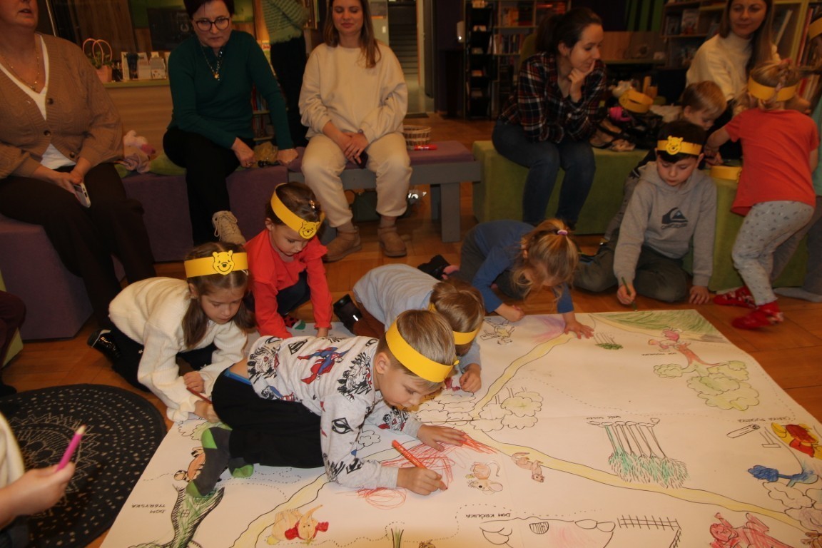 Kolejnym punktem spotkania była prezentacja multimedialna, dzięki której dzieci poznały historię A.A. Milne’a oraz okoliczności powstania postaci Kubusia Puchatka. Następnie uczestnicy tworzyli mapę Stumilowego Lasu, wykazując się kreatywnością i świetną współpracą. Nie zabrakło także tańców i wspólnej zabawy, które dostarczyły wszystkim wiele radości.