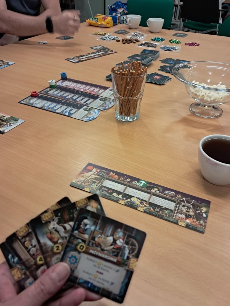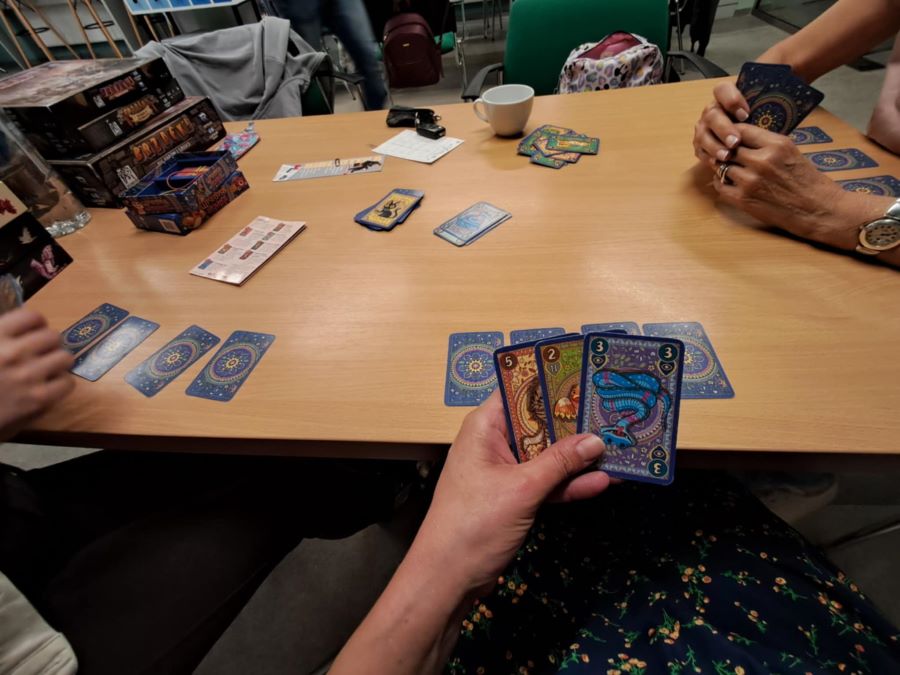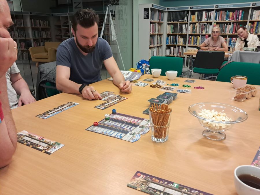 Po pełnych dwóch miesiącach rozłąki członkinie i członkowie znów spotkali się w murach naszej biblioteki, by świętować już rok od założenia Klubu ZGRAJA. W ramach dwóch wrześniowych spotkań szalona ekipa przypominała sobie znane im gry, ale oczywiście nie obyło się bez nowej planszowej niespodzianki, jaką była gra karciana „Podziemne imperium” osadzona w świecie Osadników. Znajdziemy w niej budowanie silniczka, intuicyjne zasady, cudne ilustracje oraz niezwykle przyjemną rozgrywkę pełną reakcji łańcuchowych i wzajemnychpowiązań między kartami. Rozbudowujemy swoją kopalnię, korzystamy ze zdolności sześciu frakcji, awansujemy na torach Postępu i… pokonujemy przeciwników na punkty! Poza tym w ruch poszły znane już karty „Snu”, „Tajniaków”, „Wrednej małpki” i wielu innych szybkich i łatwych gier.