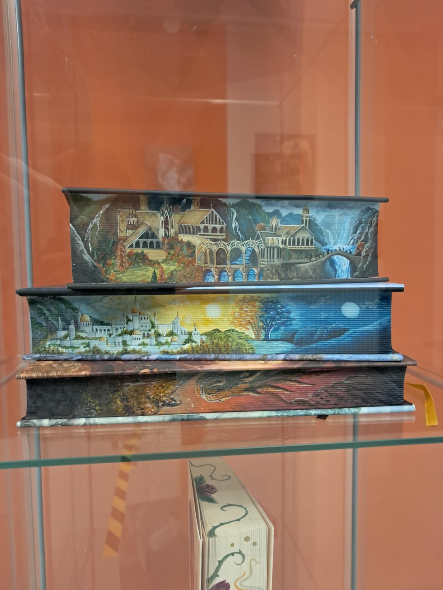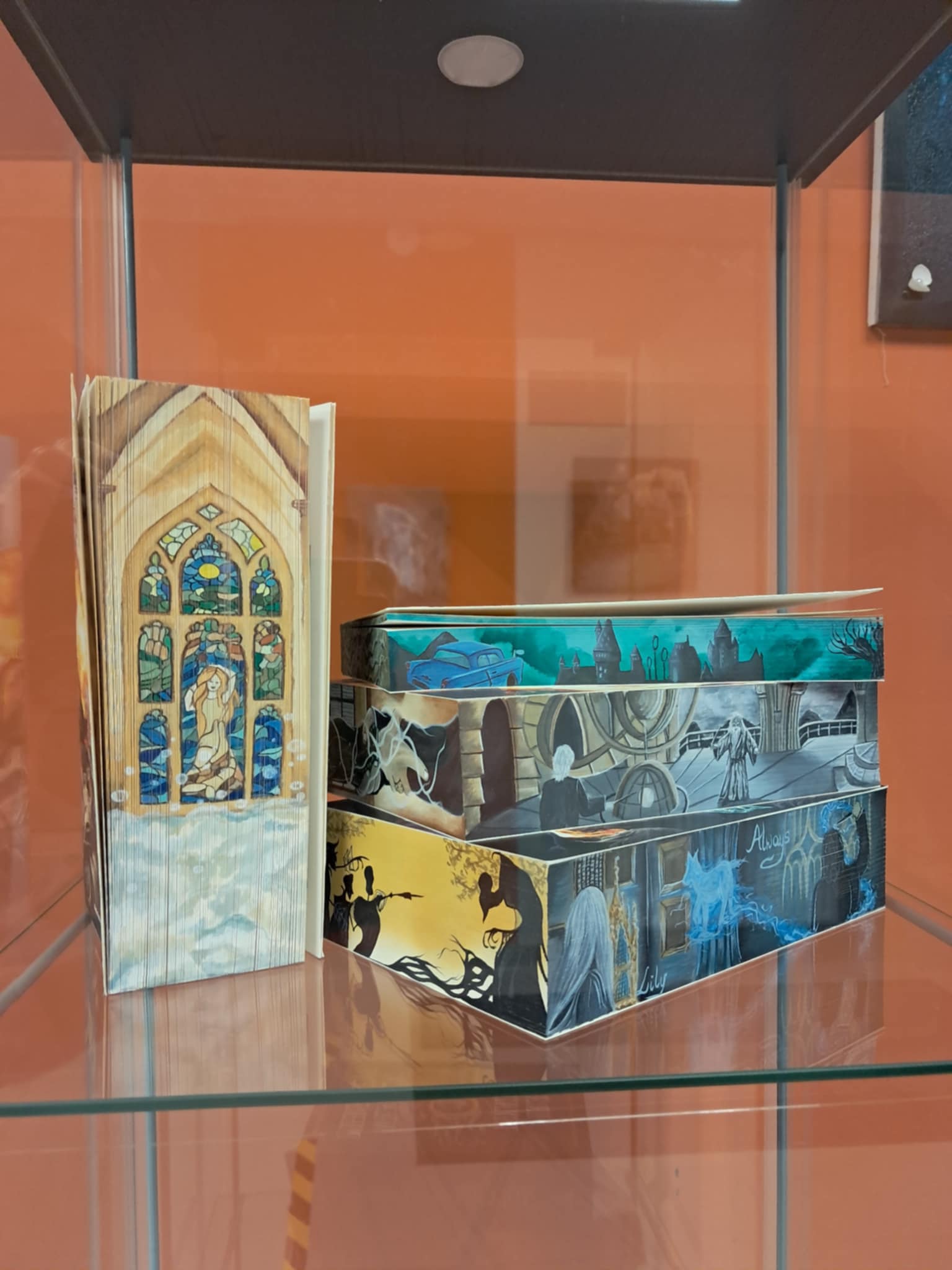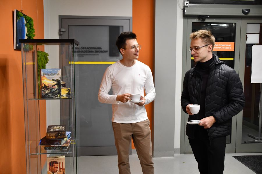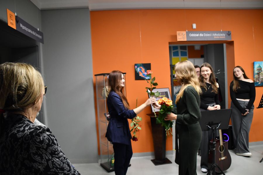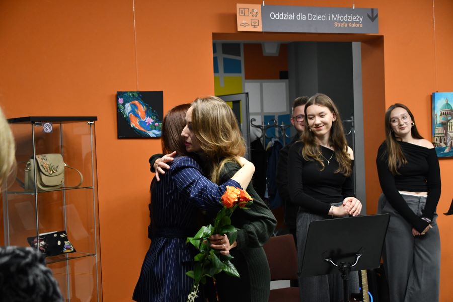 Szczególne zainteresowanie wzbudziły malowane brzegi książek – subtelne kompozycje ukazujące motywy literackie, które pojawiają się dopiero wtedy, gdy książka zostanie odpowiednio uchylona. To właśnie w takich detalach najlepiej widać artystyczną wrażliwość i precyzję autorki. Podczas spotkania artystka opowiedziała o swojej drodze twórczej, inspiracjach oraz o idei „dawania drugiego życia” przedmiotom. Podkreślała, że sztuka nie musi ograniczać się do płótna – może przenikać codzienność, stając się jej integralną częścią.