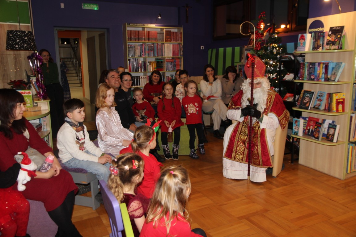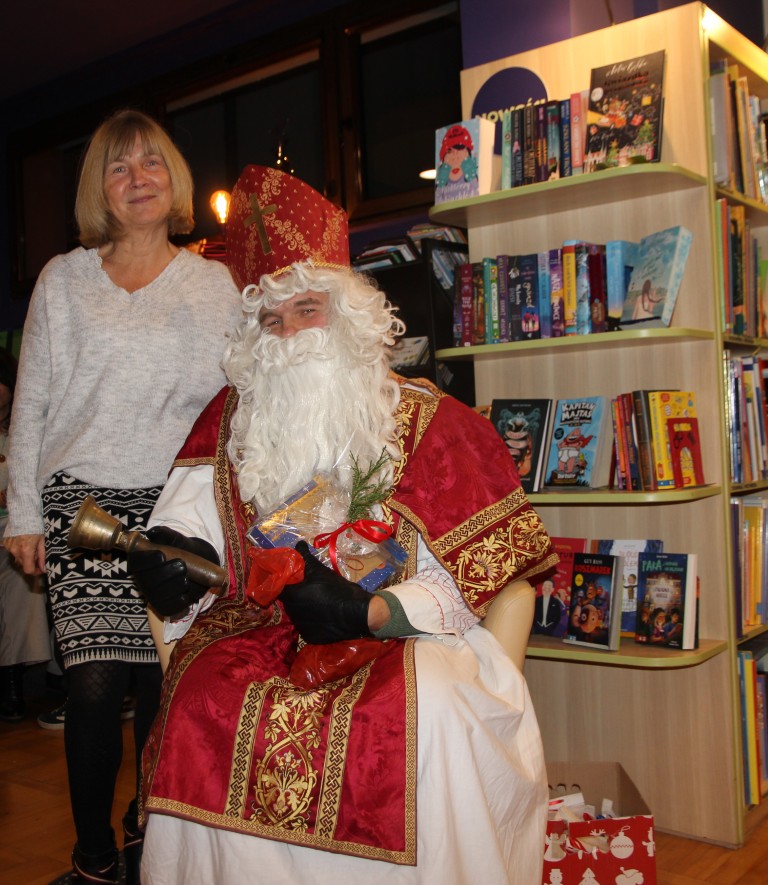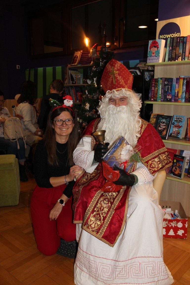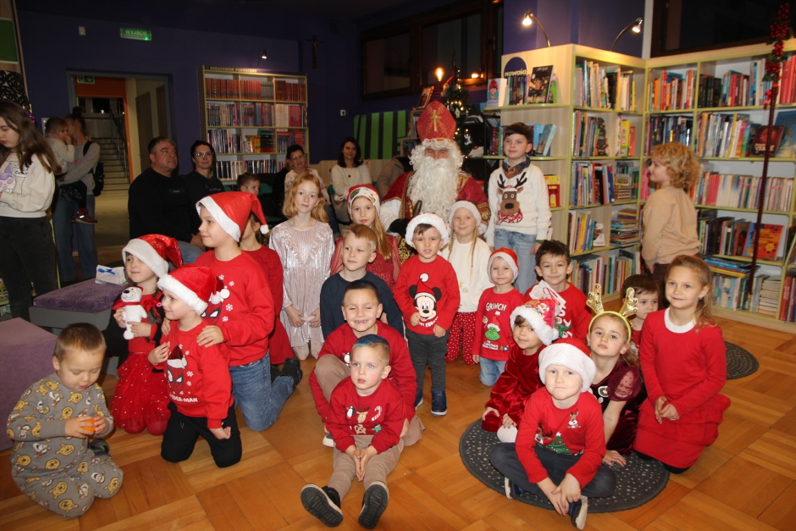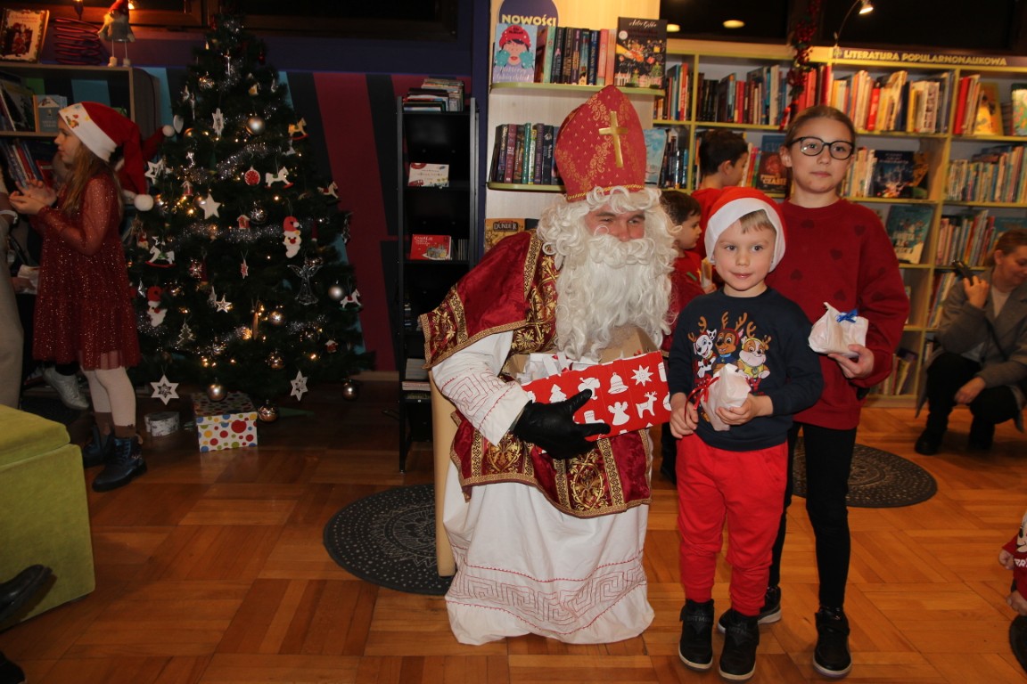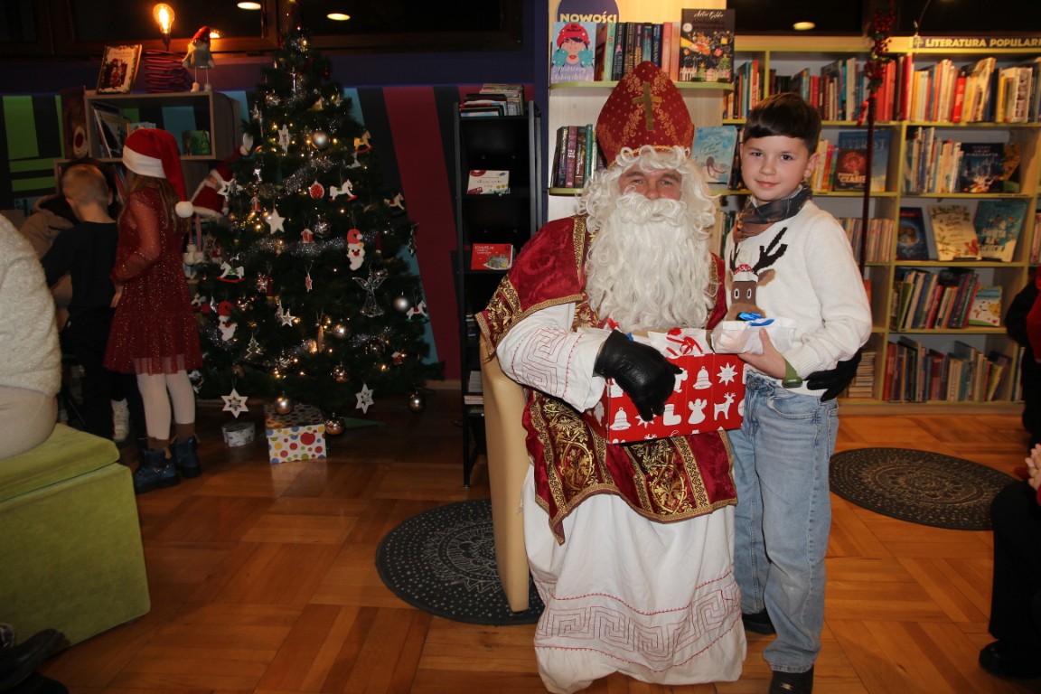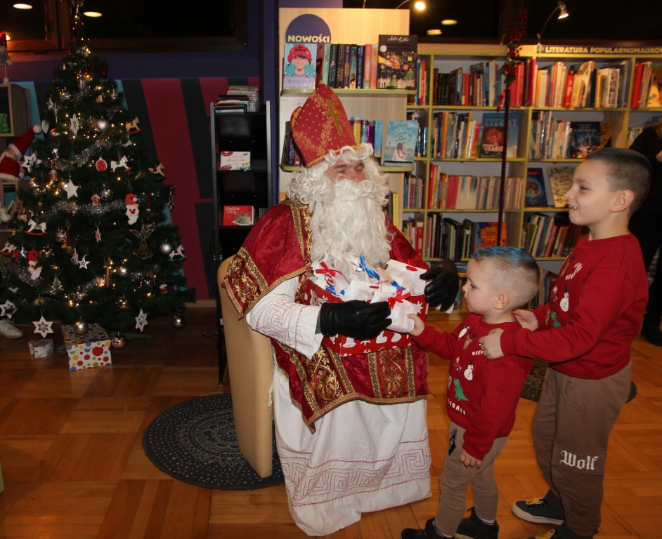 Kiedy wybrzmiały ostatnie słowa legendy, w bibliotece pojawił się Święty Mikołaj z Miry. Jego wejście wzbudziło ogromną radość – czerwone szaty, dostojna mitra i pastorał nadawały mu wyjątkowy, bajkowy wygląd. Mikołaj nie tylko przyniósł podarunki, ale też z entuzjazmem rozmawiał z dziećmi, pytając m.in. o ich marzenia.