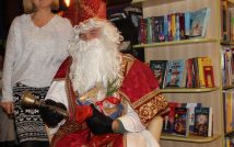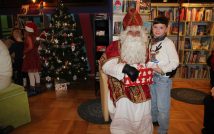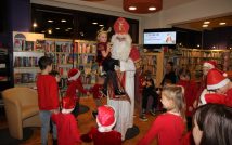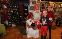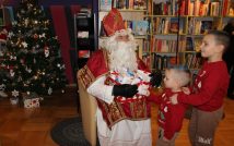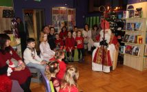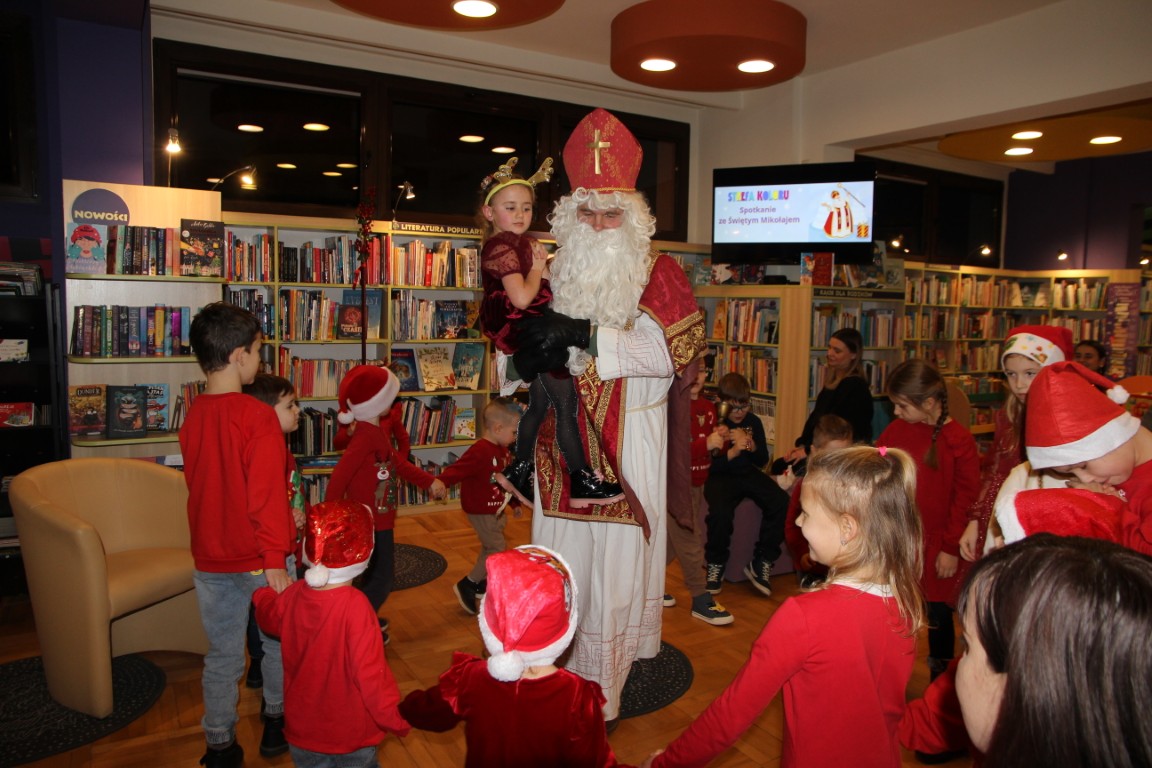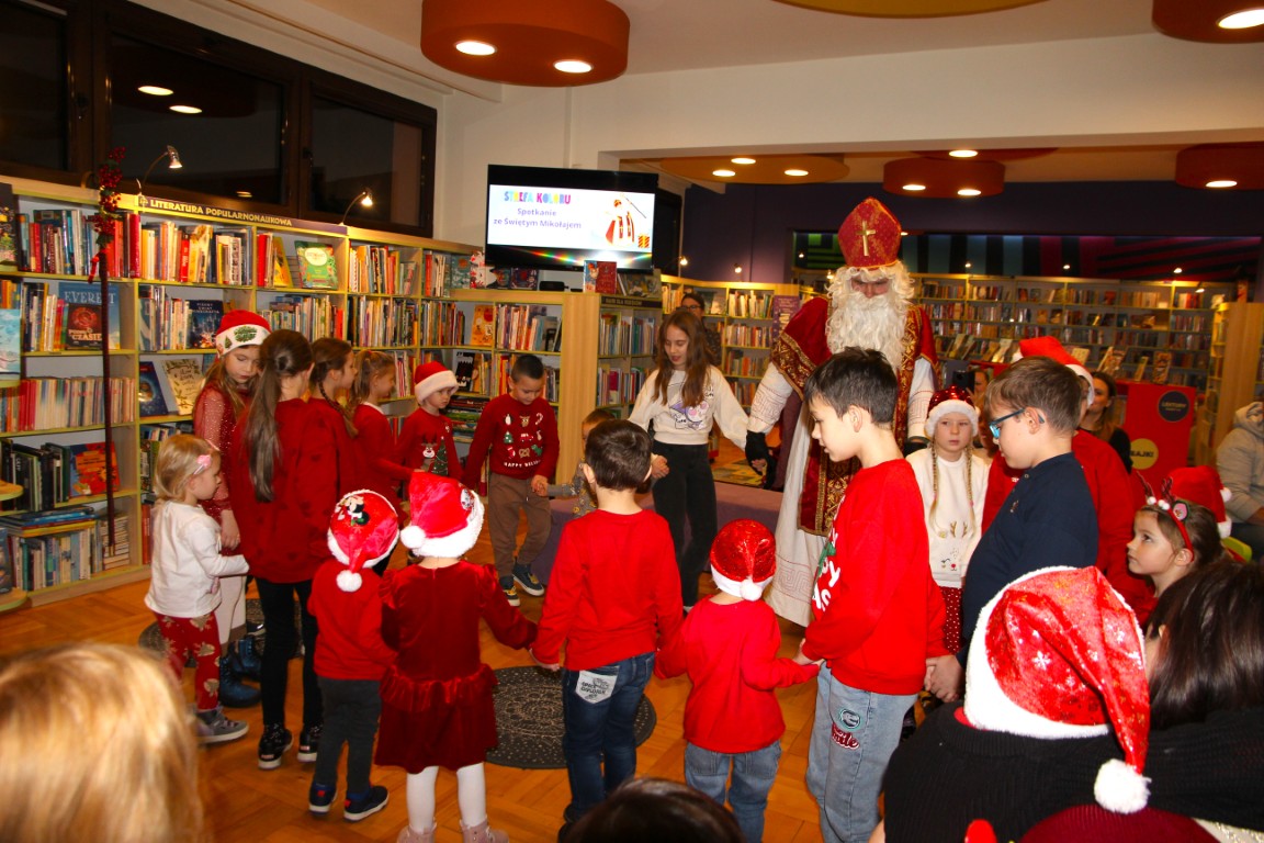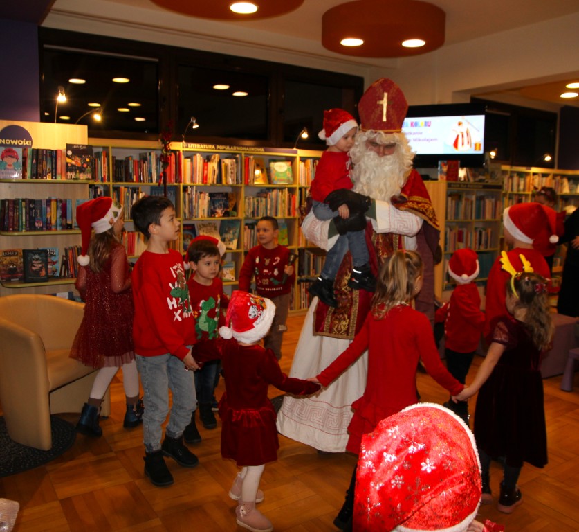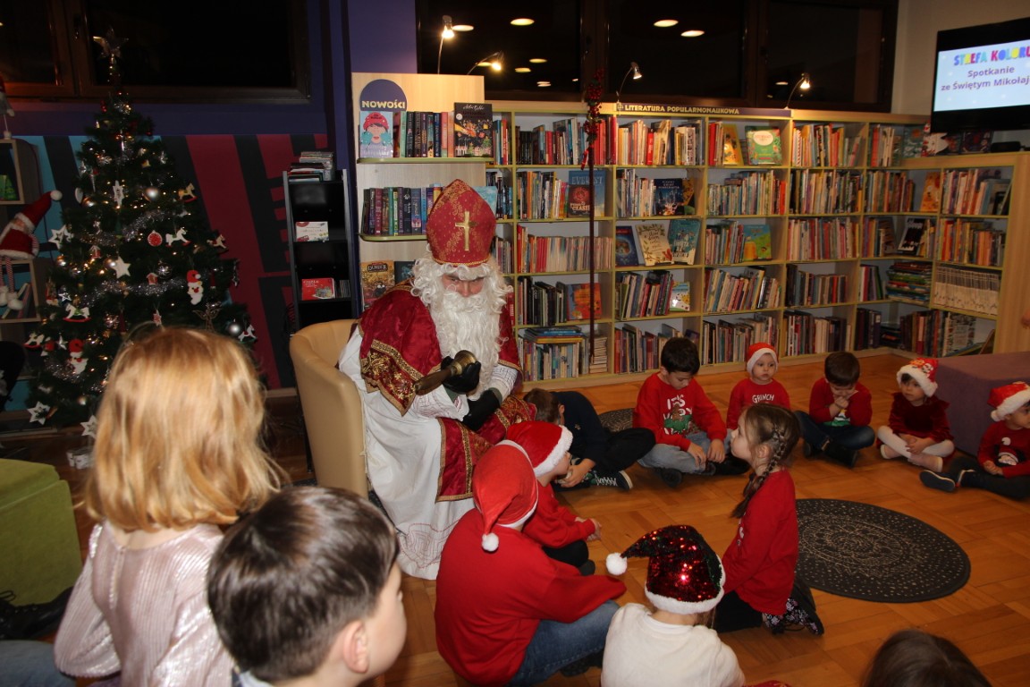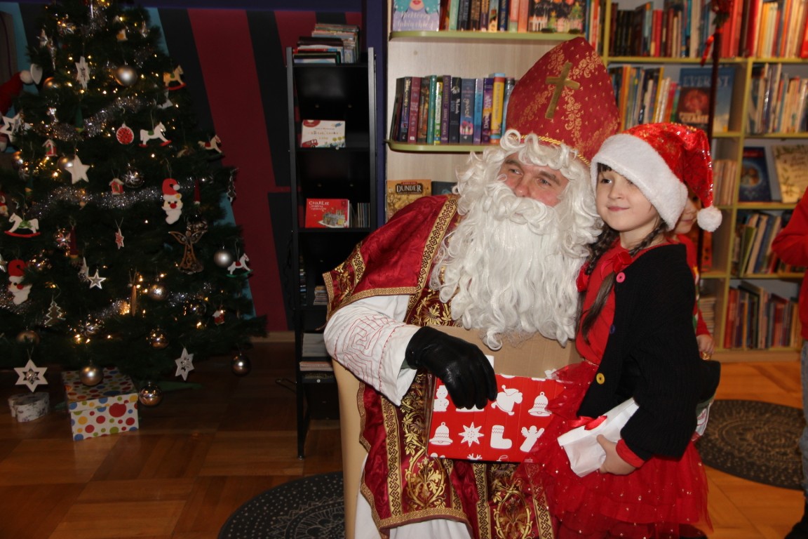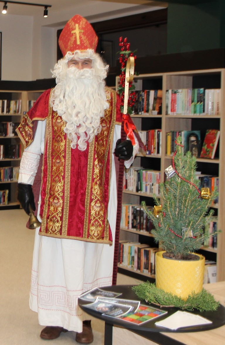 Kiedy wybrzmiały ostatnie słowa legendy, w bibliotece pojawił się Święty Mikołaj z Miry. Jego wejście wzbudziło ogromną radość – czerwone szaty, dostojna mitra i pastorał nadawały mu wyjątkowy, bajkowy wygląd. Mikołaj nie tylko przyniósł podarunki, ale też z entuzjazmem rozmawiał z dziećmi, pytając m.in. o ich marzenia.