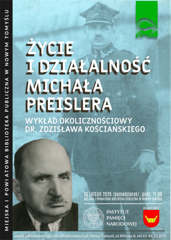 W poniedziałek, 16 lutego o godz. 11.00 zapraszamy na wykład okolicznościowy dr. Zdzisława Kościańskiego zatytułowany: Życie i działalność Michała Preislera. Wykład odbędzie się w ramach uroczystości upamiętnienia postaci Michała Preislera, zorganizowanej przez Urząd Miejski w Nowym Tomyślu i IPN Oddział w Poznaniu.